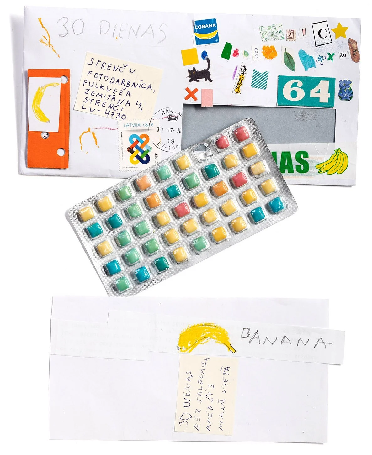 If a mail art exhibition is one that cannot be evaluated in conventional terms, then what are we to do with what we see? I propose an approach based on empathetic engagement, which I will illustrate with Elza Neimane’s mail art piece of colorful sweets, accompanied by the text: “30 days without sweets — eat these in my place.” The work invites us to step into someone else’s skin — it shifts the focus toward relationships (I will not eat; I will give them to you, and you will eat them while I abstain). Mail art presumes that what is sent is something personally meaningful or important to the sender, and I have no right to declare it uninteresting; my task is simply to try to empathize and understand how the sender themselves sees what has been sent.