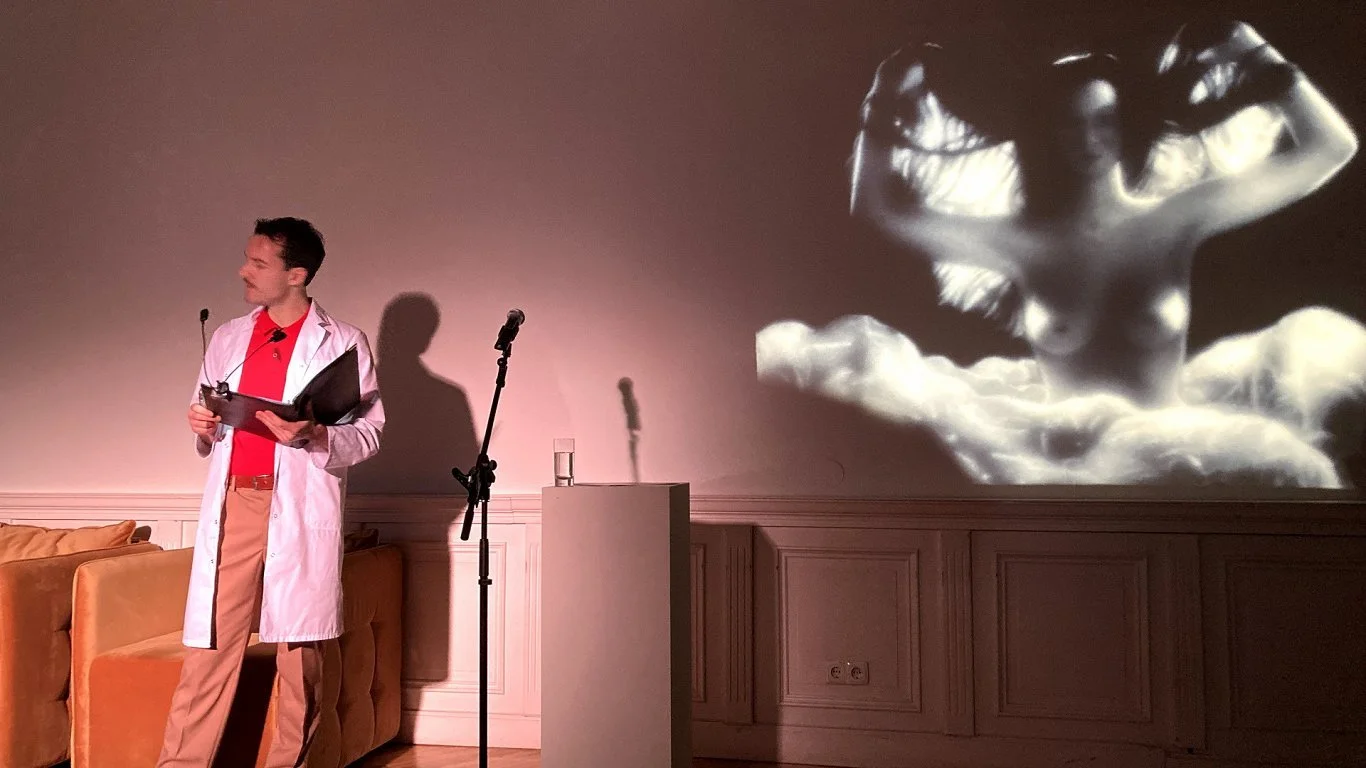 During the exhibition Gleizds, Paper, Scissors, we sought to engage with the ideas of the sexologist Jānis Zālītis—who was known for his progressive thinking on intimacy and human relationships—by exploring his views on the connection between the creative and sexual faculties in human life through a performance of the lecture “On the Eroticisation of Family Life,” alongside a presentation of Jānis Gleizds’s colour slides.